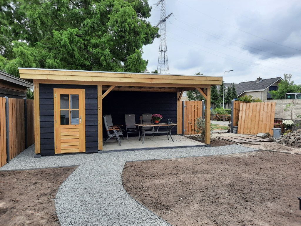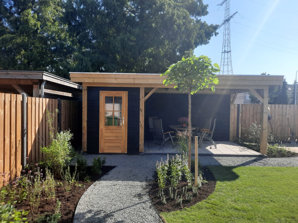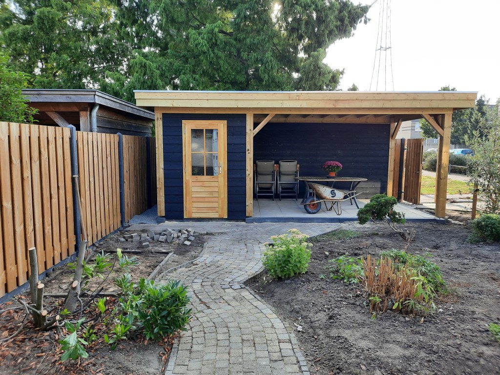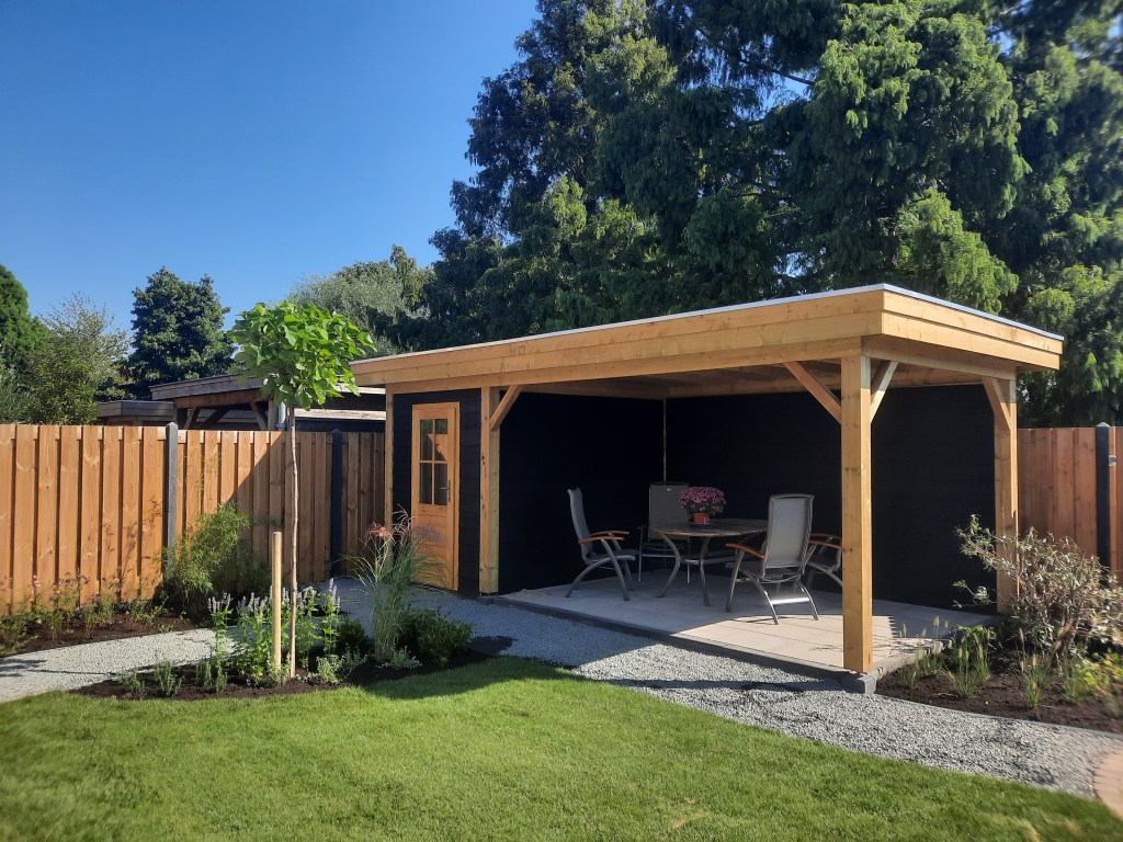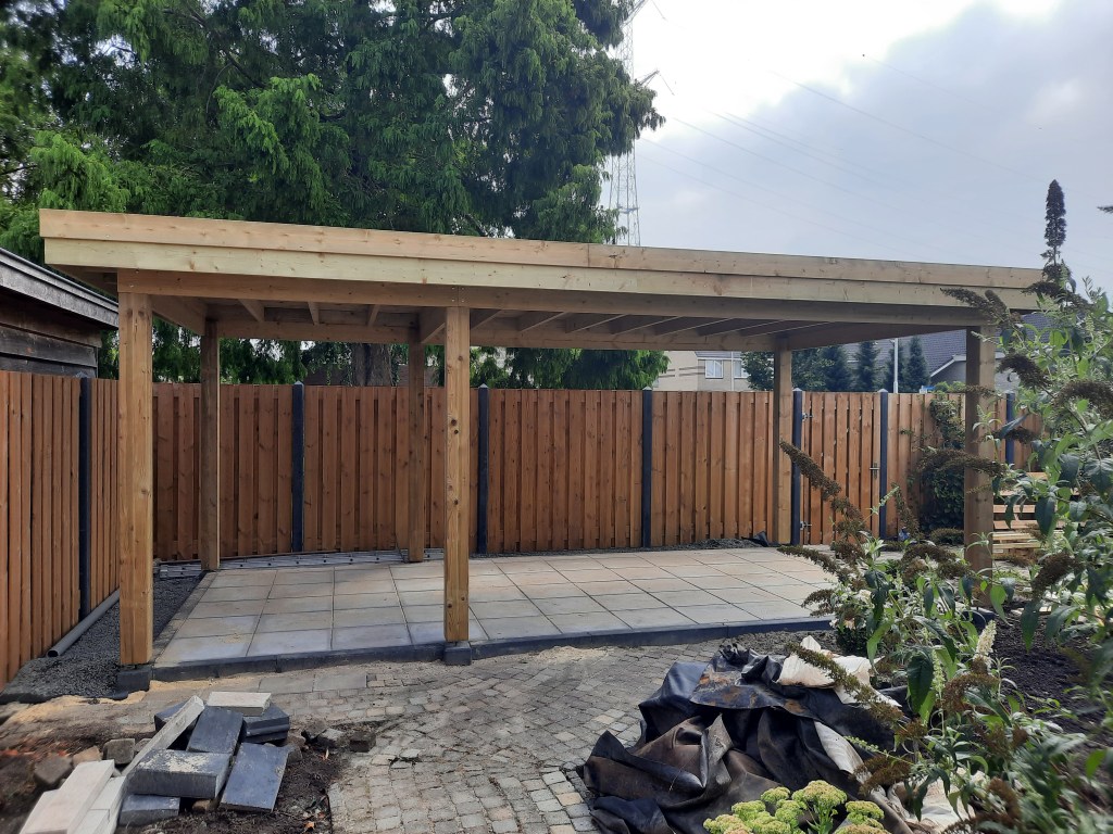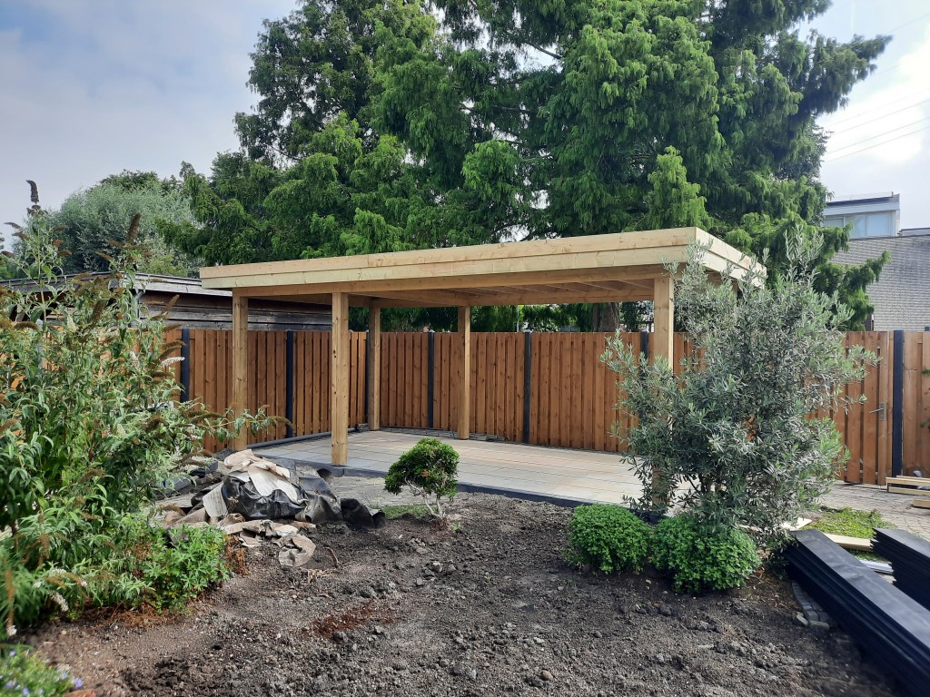 Anläggning staket, veranda och trädgård.