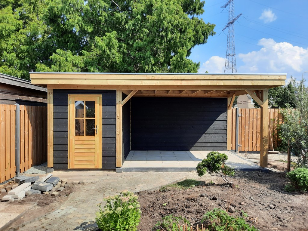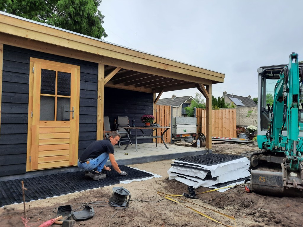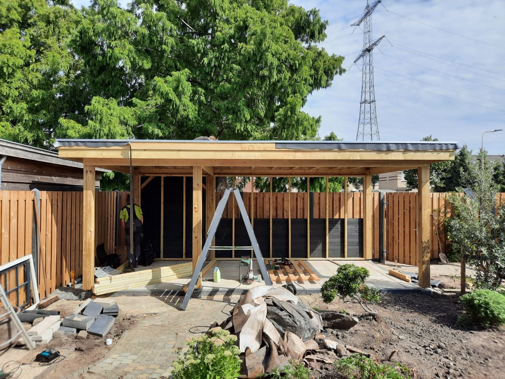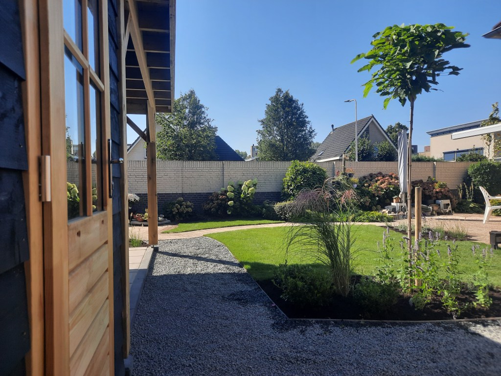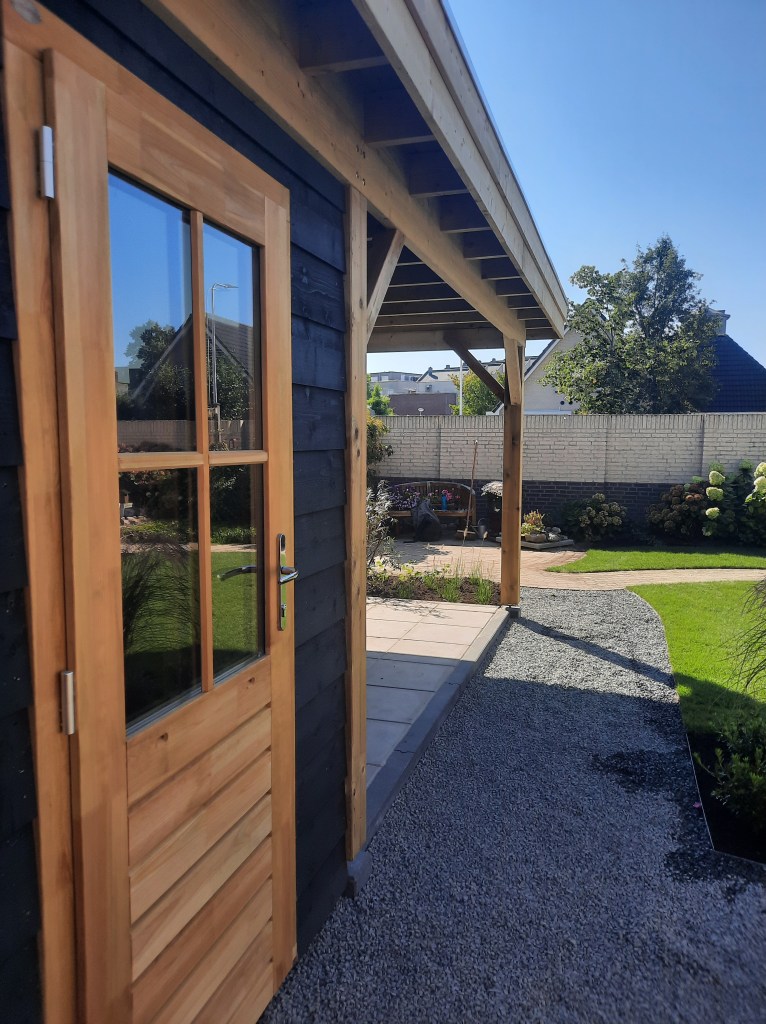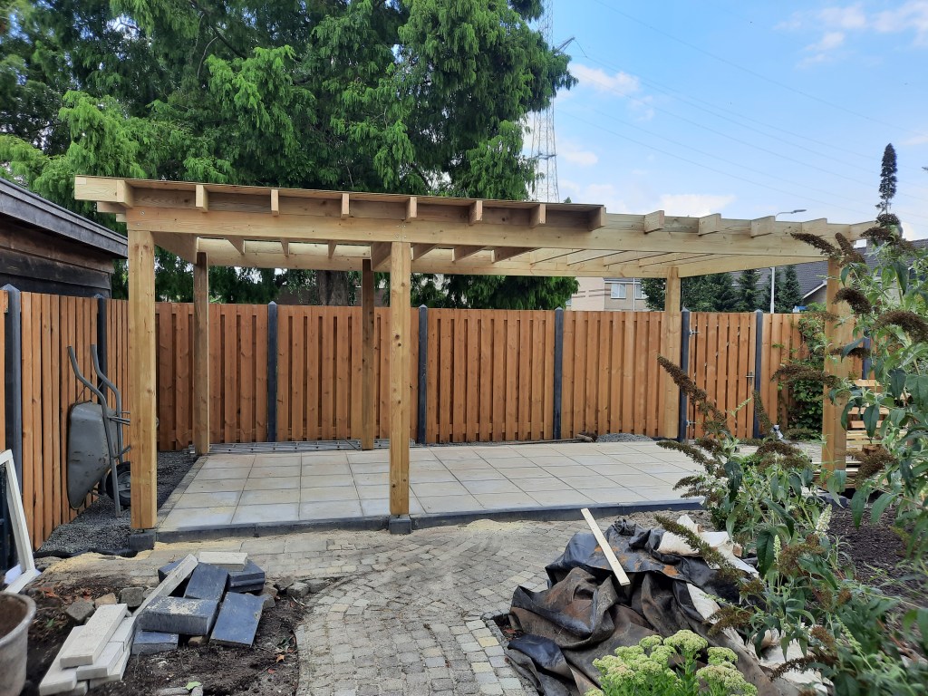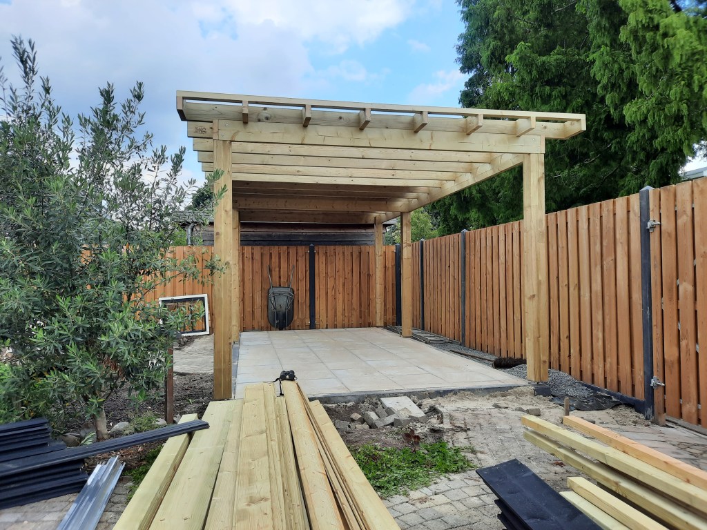 Anläggning staket, veranda och trädgård.