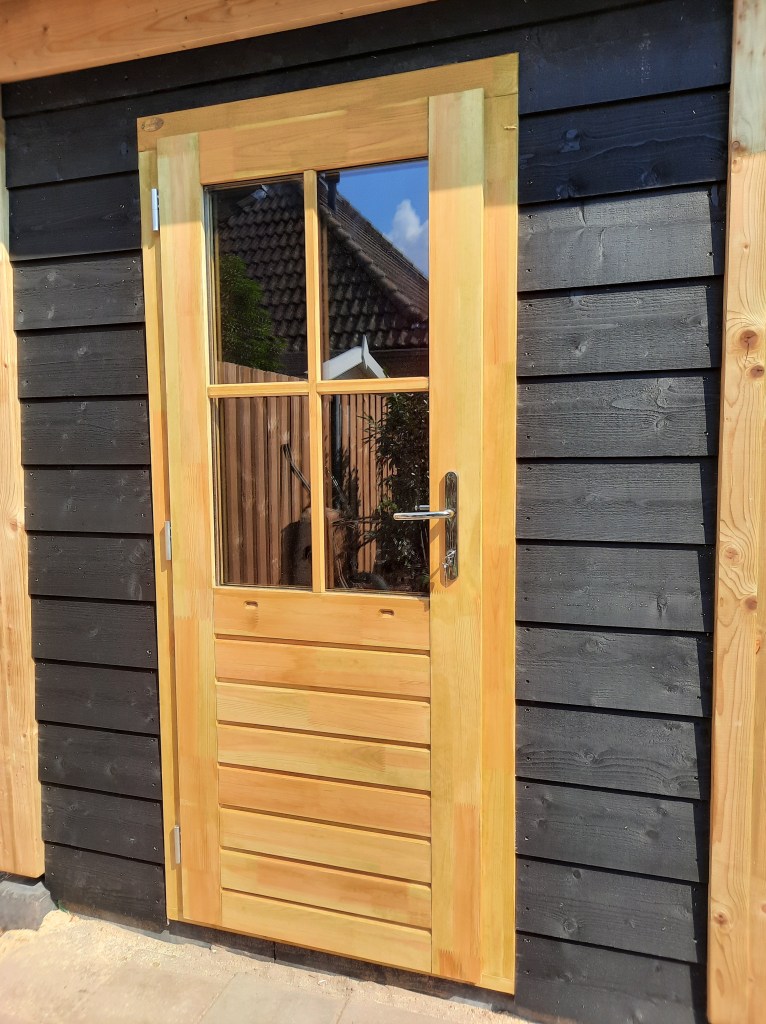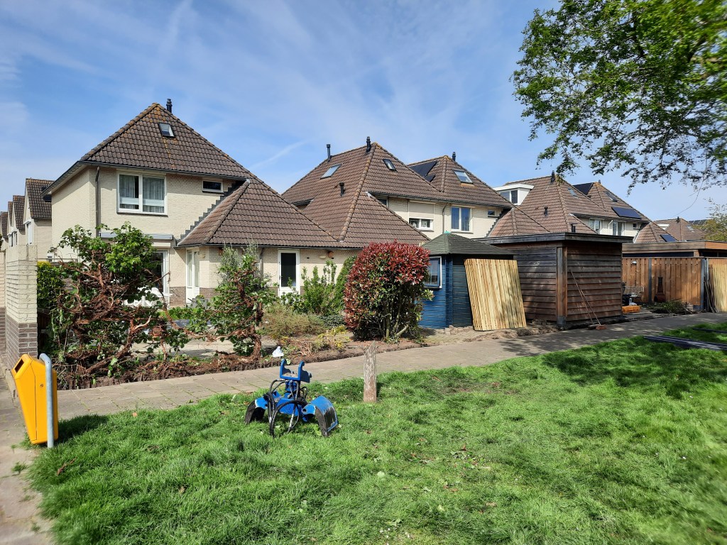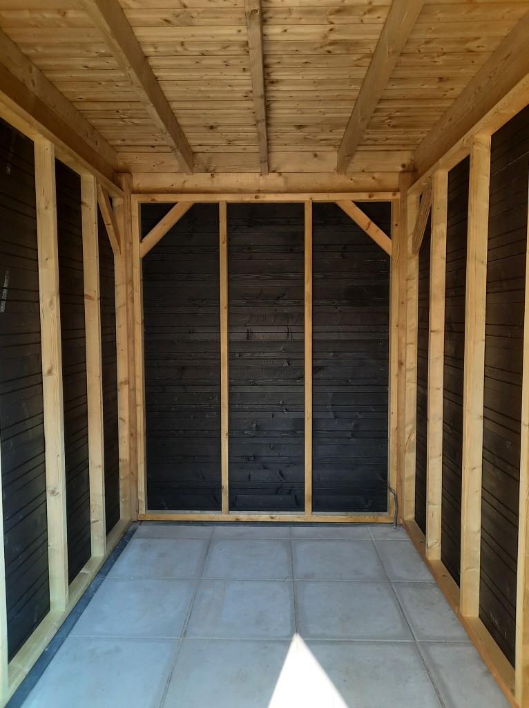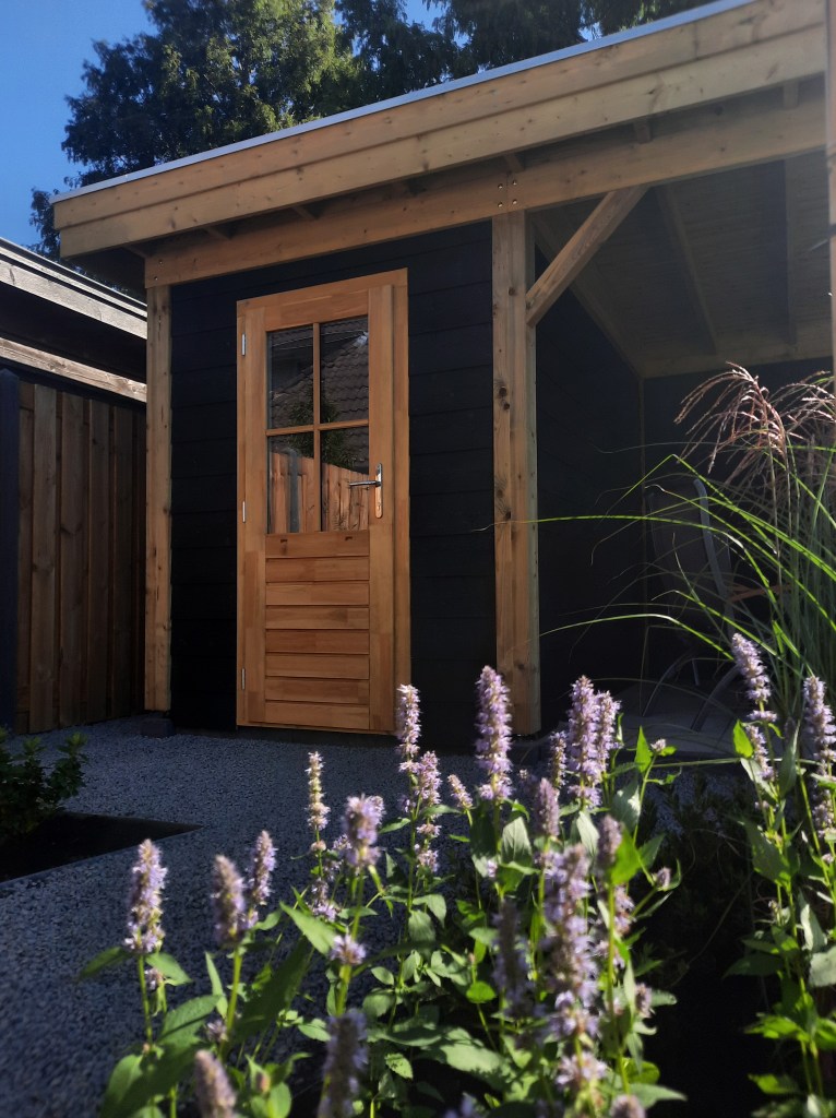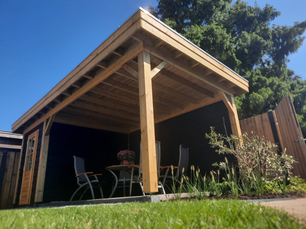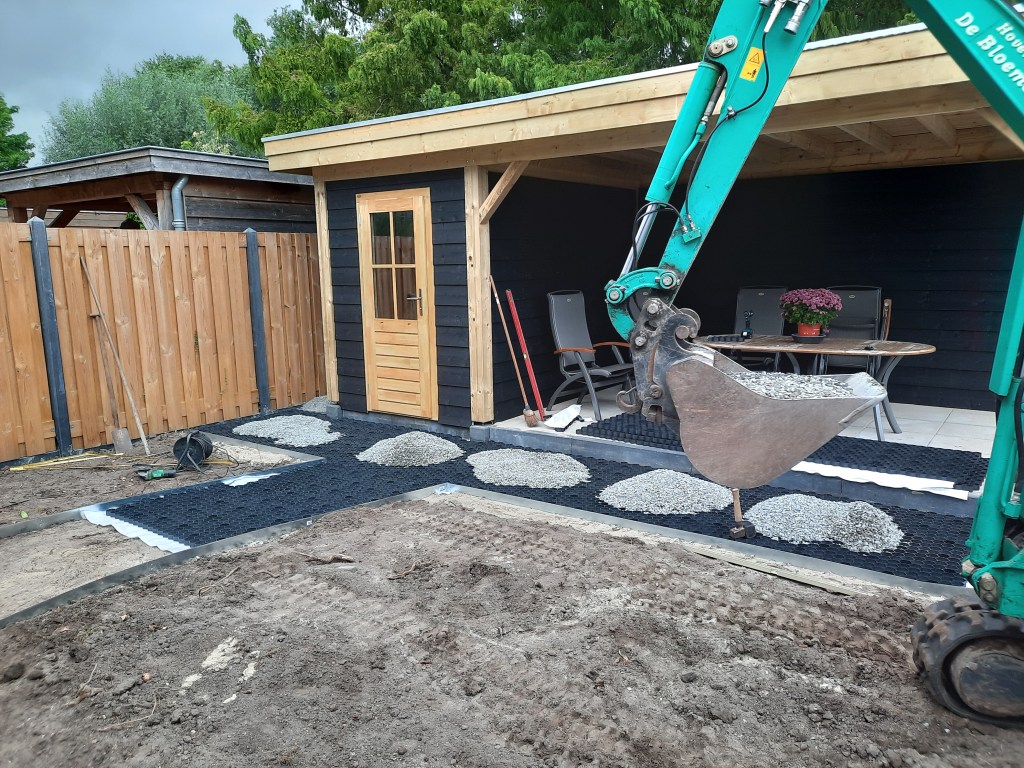Anläggning staket, veranda och trädgård.