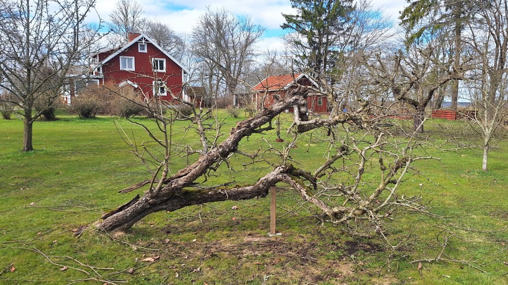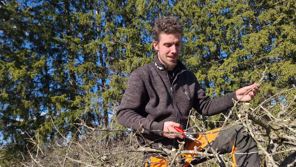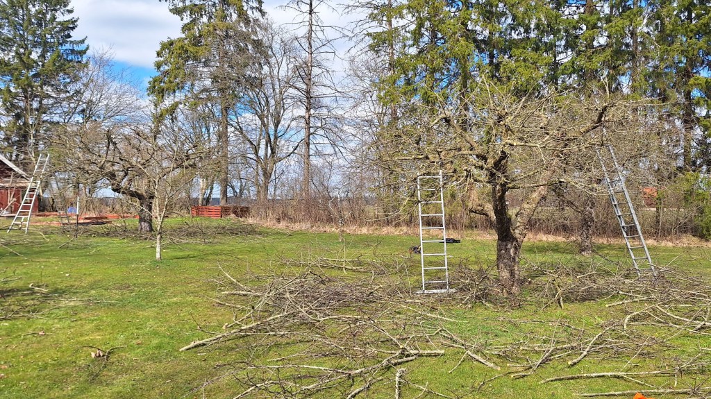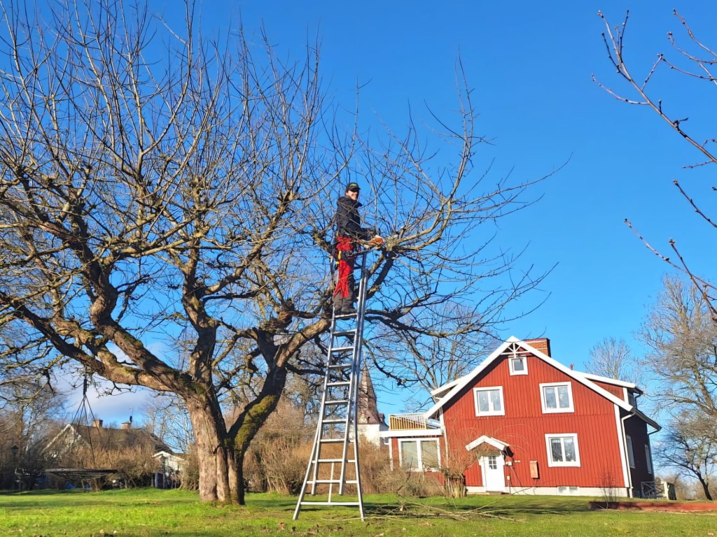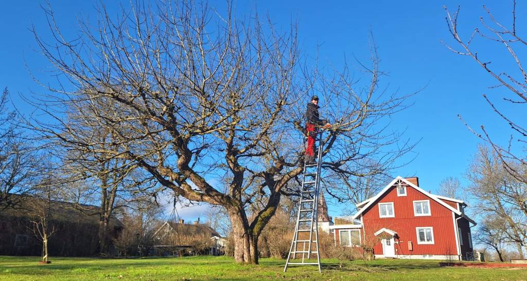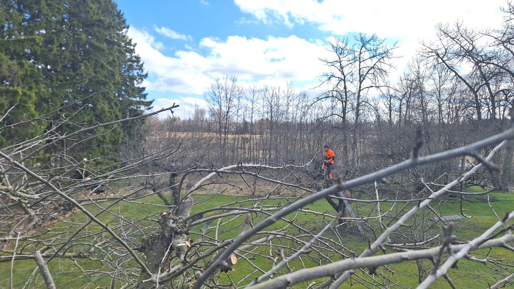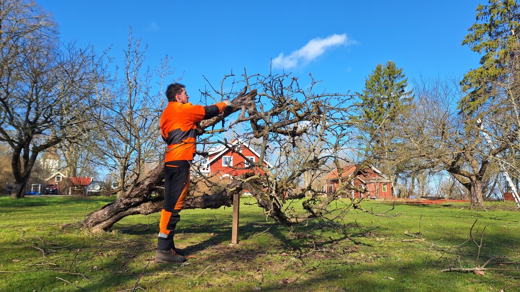 Beskärning av äppelträd i en fruktträdgård.