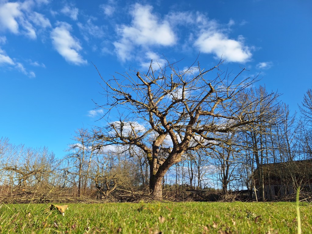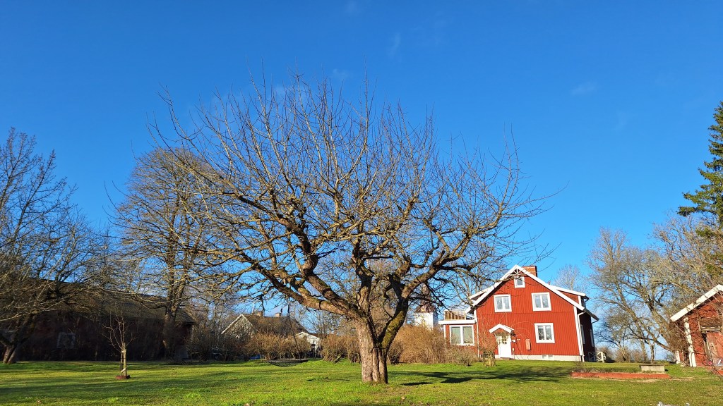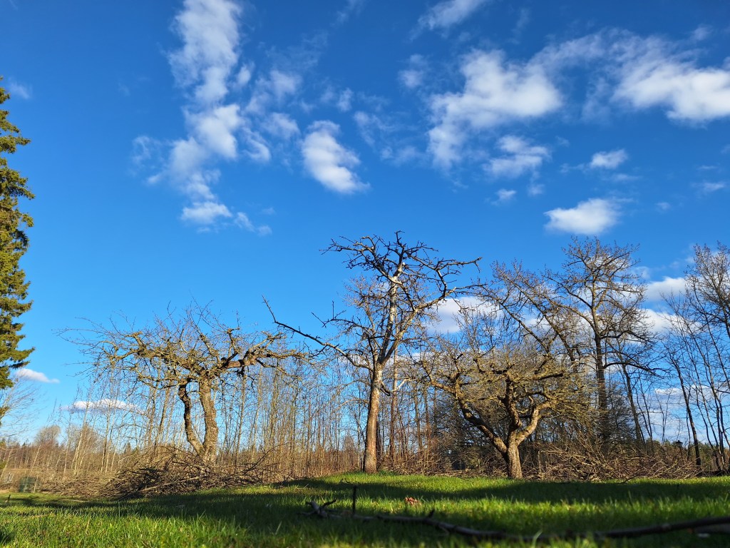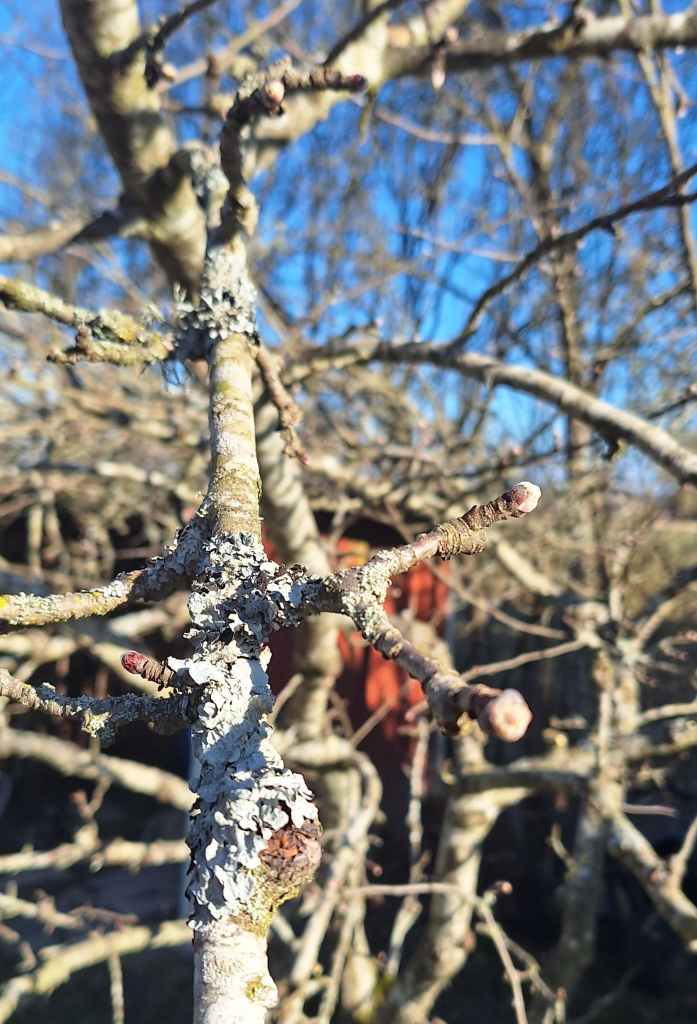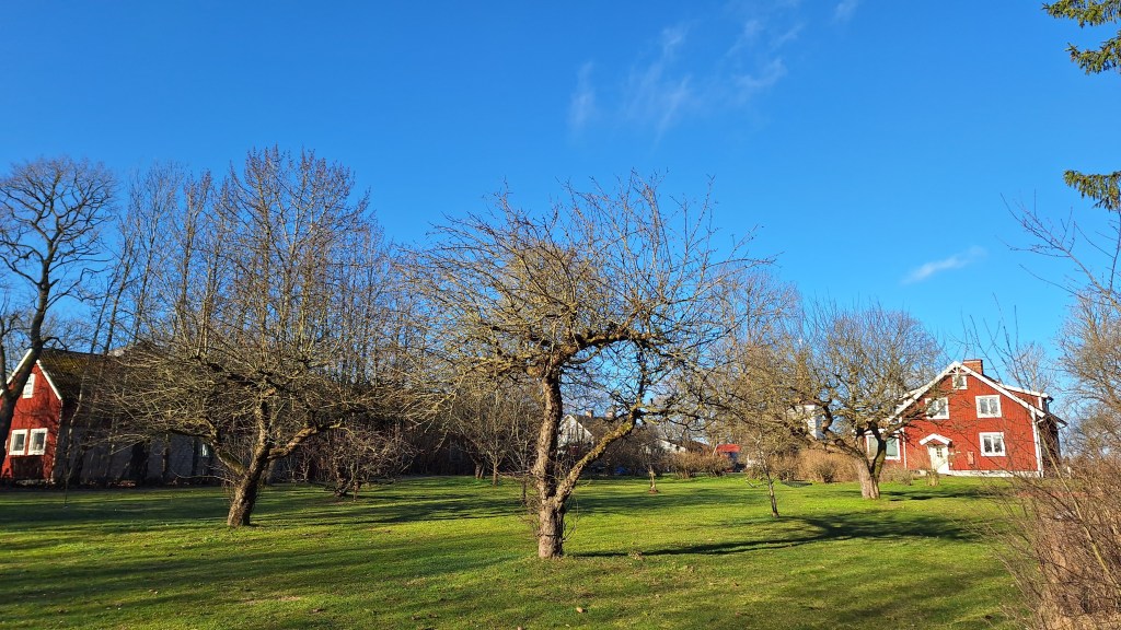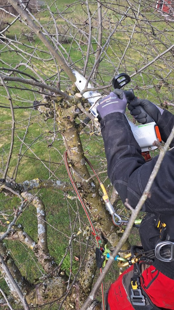 Beskärning av äppelträd i en fruktträdgård.